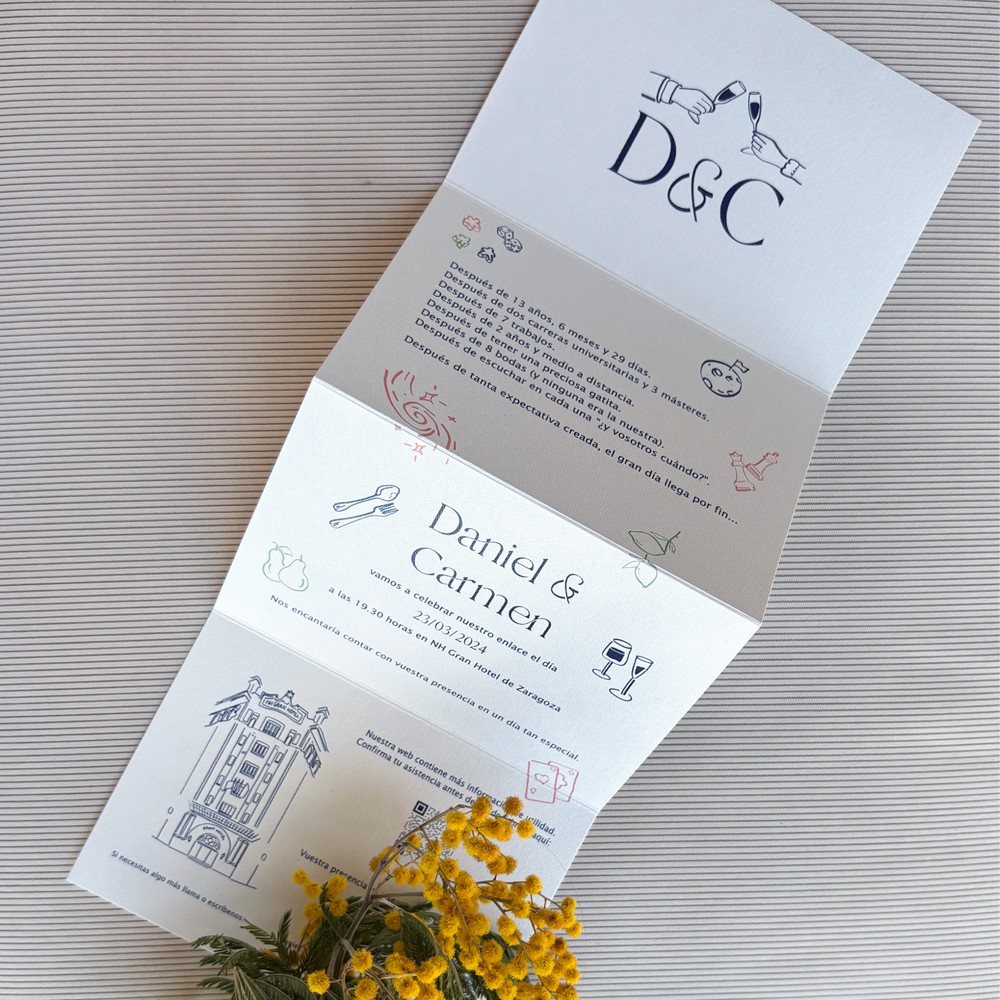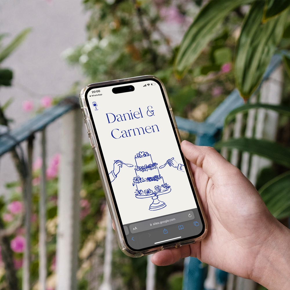 Stationery and web design created for Daniel & Carmen's wedding. A folded invitation with hand-drawn illustrations paired with a matching digital invite. Everything was designed to feel personal and cohesive, incorporating elements that were meaningful to them.