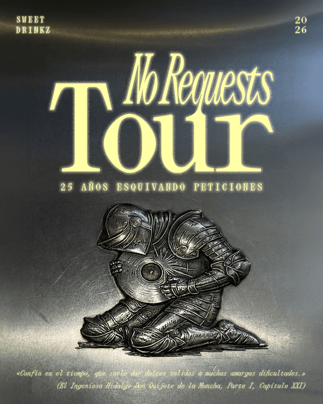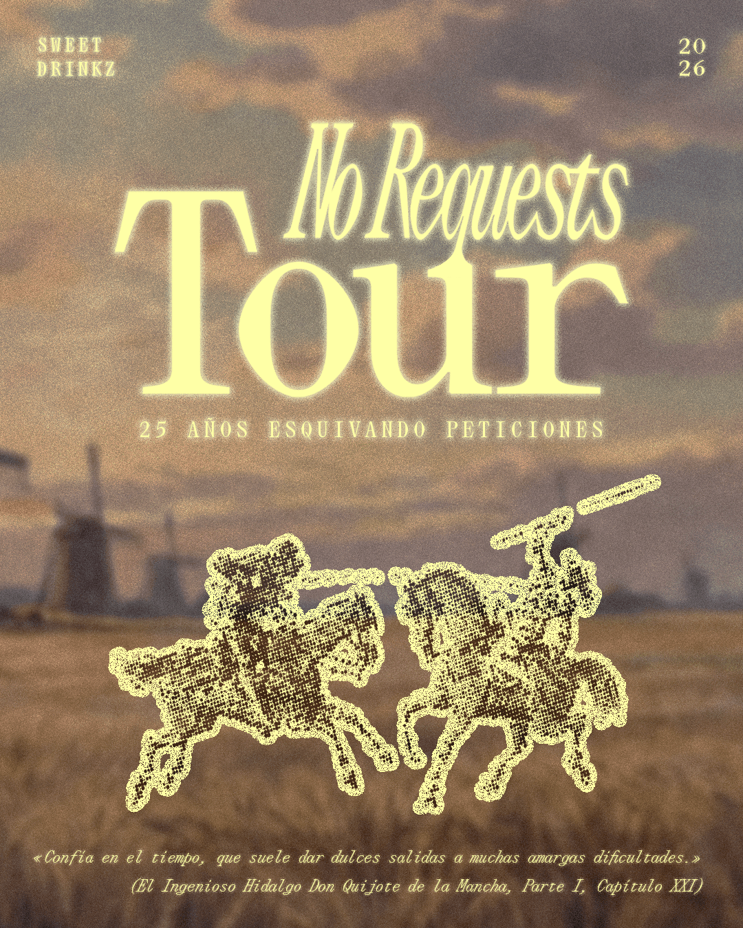 Posters created for DJ Sweet Drinkz to promote his European tour “No Requests: 25 años esquivando peticiones”, a celebration of his 25‑year trajectory behind the decks. Known for his presence in clubs and events across Spain and Europe.